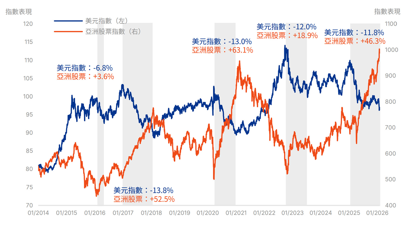 資料來源:彭博,數據由2014年1月1日至2026年1月31日。美元指數為US Dollar Index;亞洲股票指數為MSCI AC Asia ex Japan Index。*彭博,數據截至2026年1月31日。以MSCI US Index及MSCI AC Asia ex Japan Index的市盈率比較。以往表現不代表將來表現。