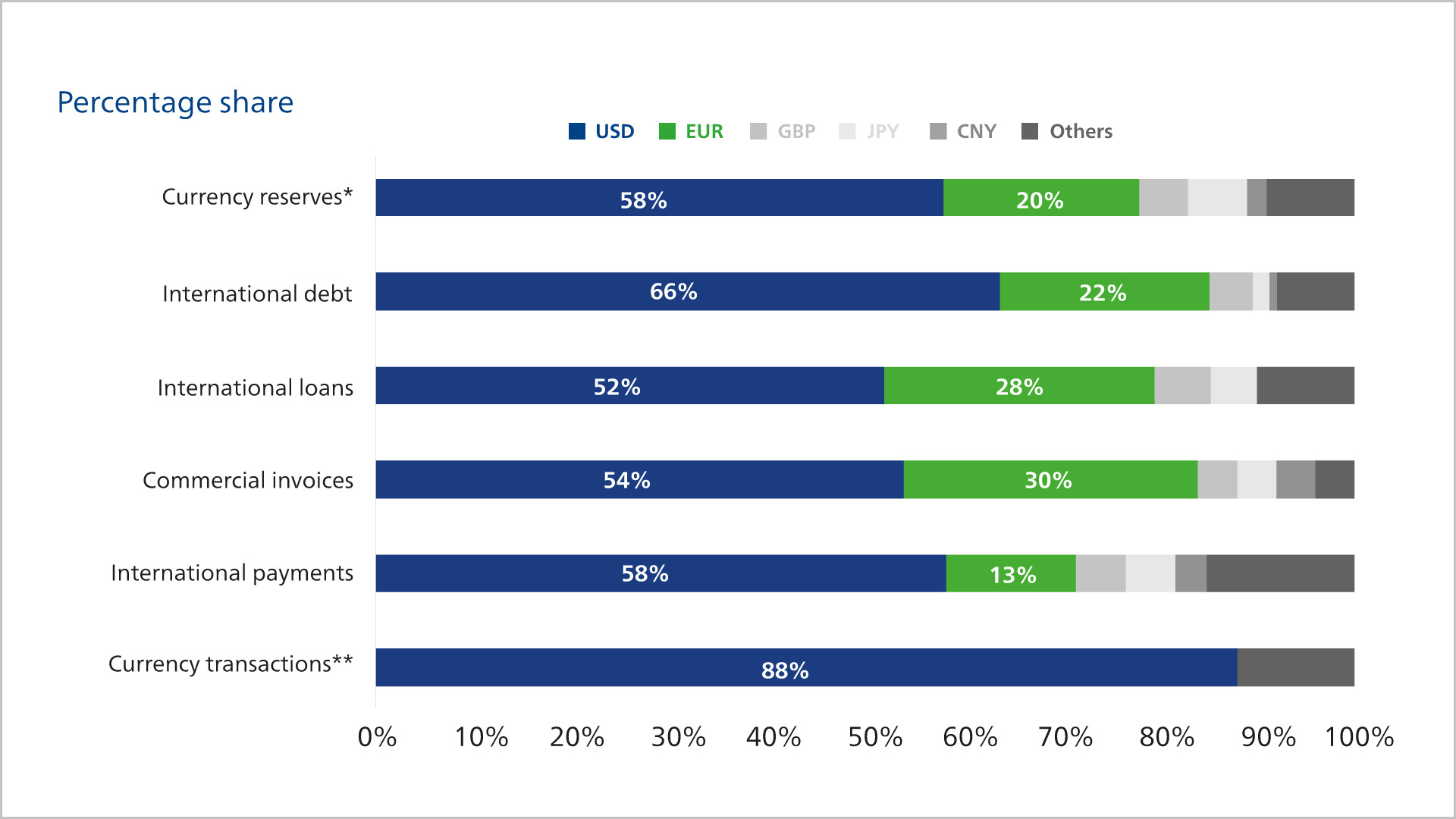 The dollar dominates all types of international financial transactions.