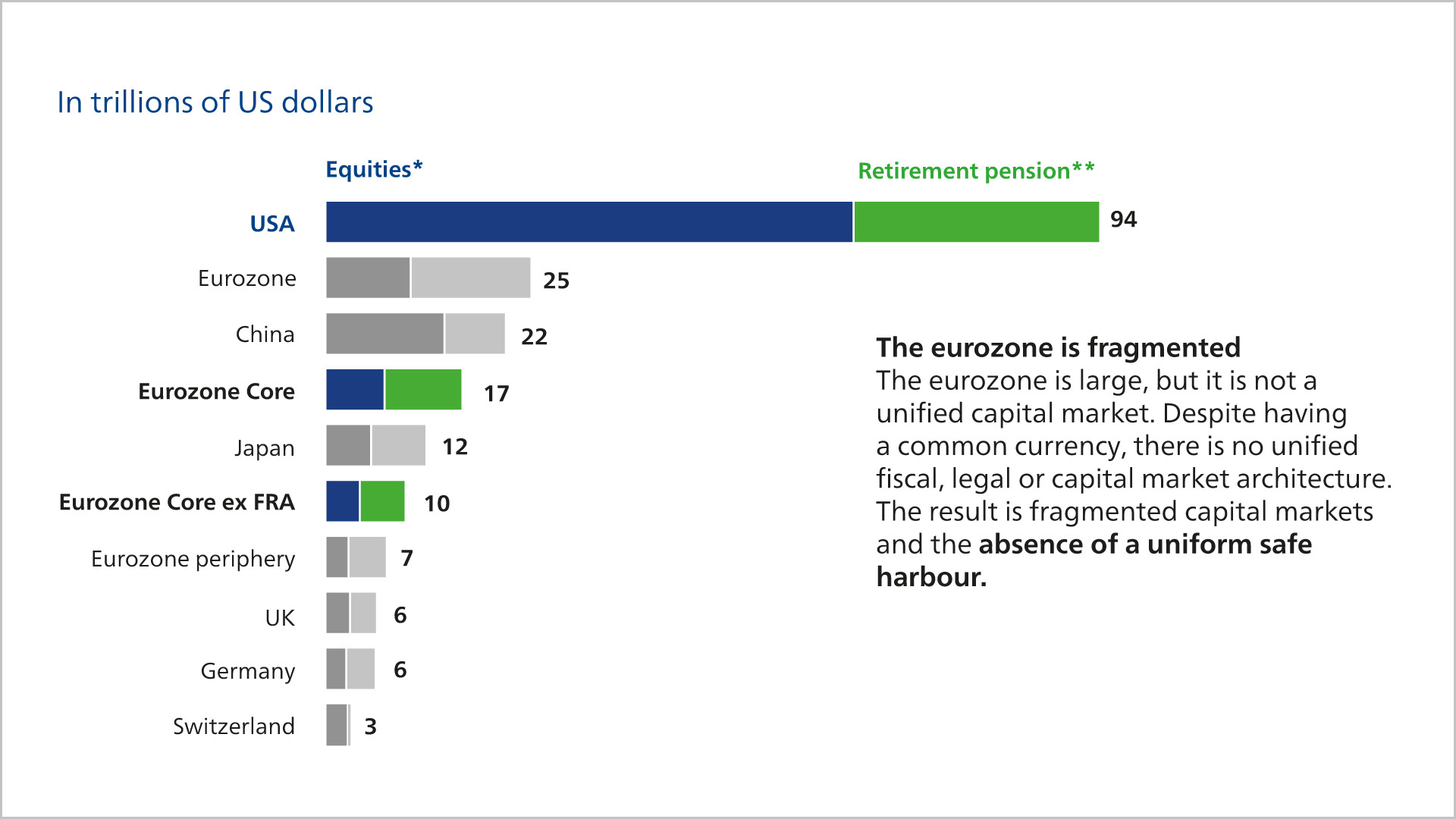 This becomes relatively clear when comparing what distinguishes the USA and what the euro area lacks. At the top of the list is that, from an economic perspective, the economic and monetary union of the euro countries is still incomplete. There is a common currency and monetary policy, as well as a certain legislative competence at the EU level in specific areas. However, compared to the USA, the euro area is still more of a loose association of nation-states, with predominantly its own laws and administrative regulations, different tax and social systems, and divergent fiscal policies. In the political sphere, national interests always take precedence in case of doubt, as can be seen in discussions about potential cross-border corporate mergers. Additionally, there are language barriers and cultural differences that do not exist in the USA, or at least not to this extent.