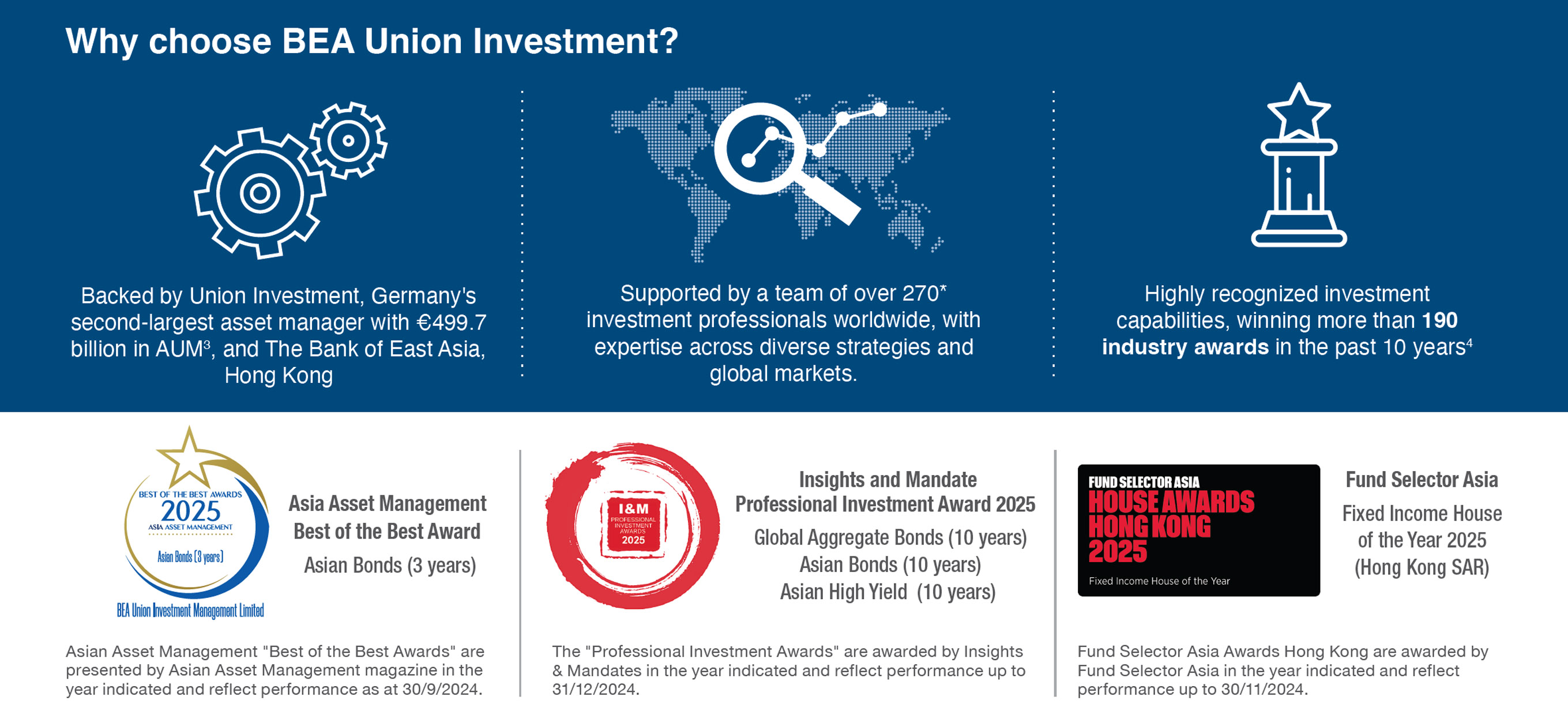 BEA Union Investment Global Quality Bond Fund (the "Fund") seeks medium to long term capital growth and regular income by primarily investing in a portfolio of global investment-grade debt securities.