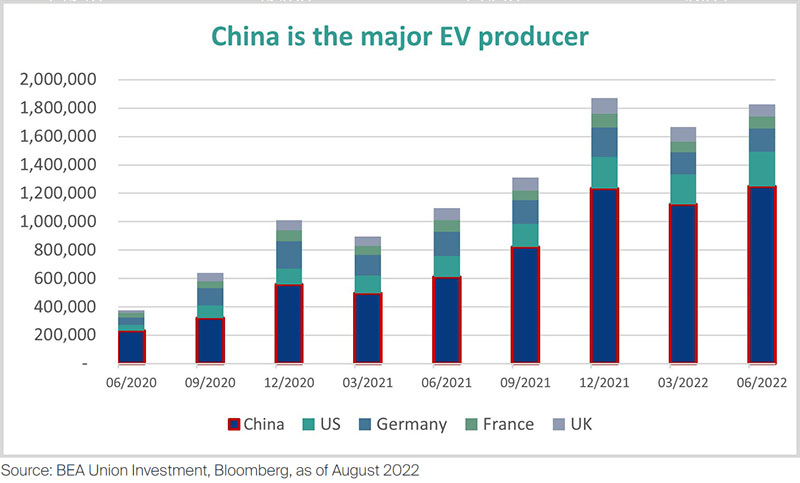 On the contrary, opportunities can still be found in secular growth industries, such as, renewables, industrial automation, and domestic consumption. To combat climate change, policies will remain favourable towards electric cars and related sectors as well as renewables. This is an irreversible trend, even if the economy softens. In 2021, the International Energy Agency estimated China could account for 95% of the world's solar energy supply chain by 2025, where building blocks for solar panel production would almost exclusively come from China. Research and development of electric vehicles will remain a highly competitive area, and Chinese firms have been on the forefront of developing lithium-ion batteries for EVs, supplying products to major global electric car makers.