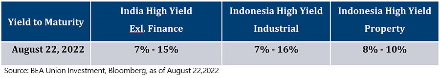 Even though the Indonesian government expressed intention to keep rates rising to quell rising inflation, but it made clear that the magnitude will not be comparable to that of the US. For that reason, together with still high commodities prices, Indonesia's bond market still has its allure in the region, and will likely continue to attract liquidity. Opportunities were particularly visible in quasi-sovereign bonds and high-yield papers. Albeit the country has just entered its rate cycle, mortgage rates were staying close at low levels, lending support to the property sector. Indonesia's first-half property sales already accounted for 44%-61% of managements' full-year guidance, on track to achieving their annual targets. BEA Union Investment anticipated that future sales will stay upbeat, while shopping mall traffic continue to recover. These will generate ample cash flow for developers. In general, property high-yield bonds remained favourable.