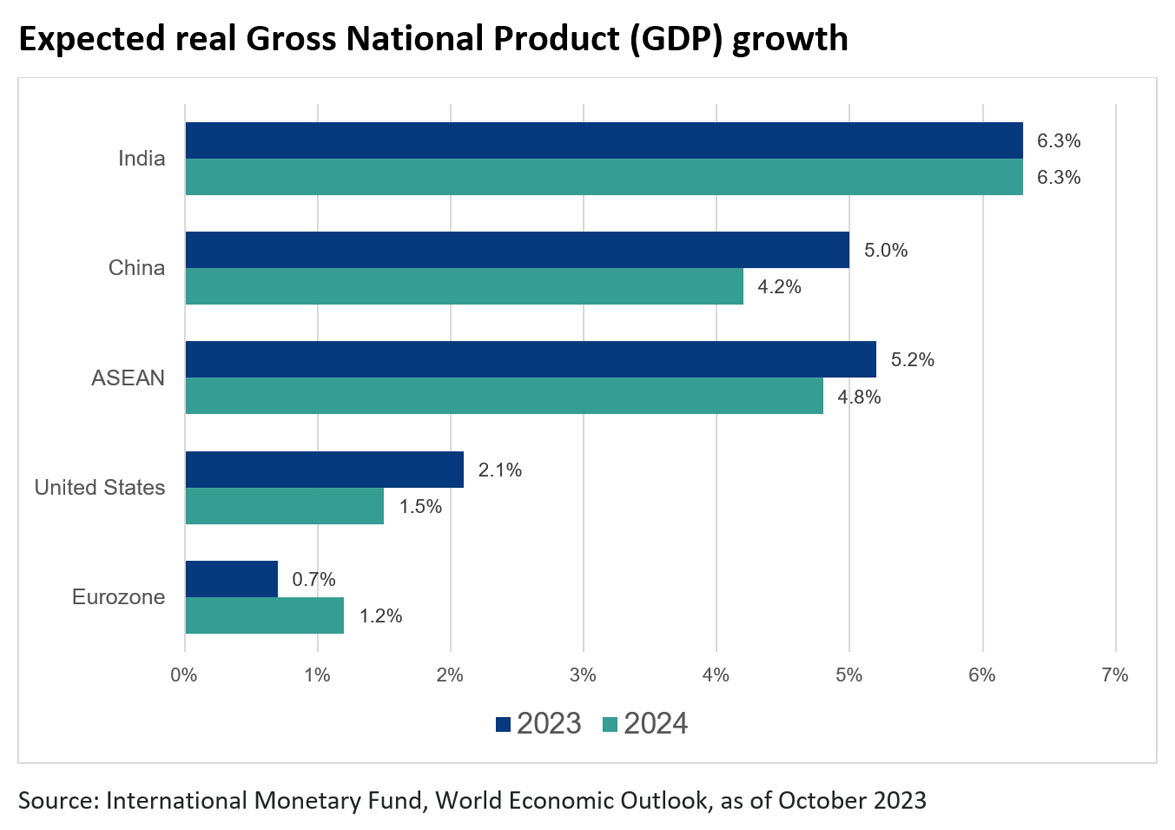 As at the end of September, India posted a stronger-than-expected year-on-year quarterly growth of 7.6%, driven by robust manufacturing activities and improving consumer sentiment. In addition, buoyed by the prospect of rising spending by the Indian government ahead of the country's 2024 election, Sensex and Nifty 50 -- the two major Indian benchmarks, repeatedly hit new highs. Equally enjoying sound fundamentals is Indonesia, which saw third-quarter GDP grew 4.9% as at end-September. The growth was solid yet there were signs of easing, which were partly contributed by softening commodities prices and falling exports. But markets expect the economy and market sentiment to receive a boost from increasing welfare budget and higher spending ahead of the country's 2024 election.