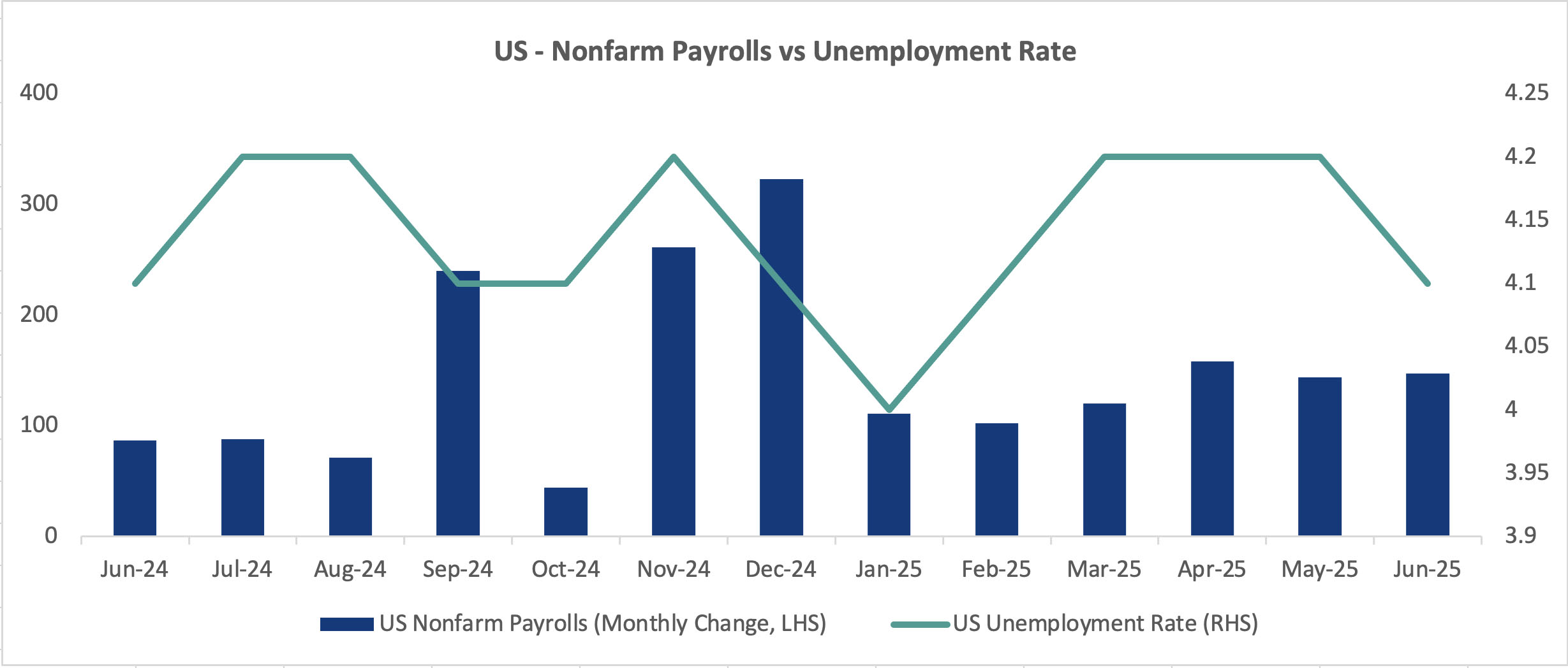 US macro data remain robust. Nonfarm payrolls rose 147,000 in June — exceed expectations and higher than previous month — while the unemployment rate fell to 4.1%. Core CPI rose to 2.9% year-over-year, reinforcing the narrative of moderate inflation and boosting confidence in a soft landing scenario. This allows the Federal Reserve greater flexibility in future policy considerations, although the full price impact of tariffs effective August 1 has yet to be seen. Overall, driven by economic resilience, robust corporate earnings, strong demand for AI, and favorable technical factors, the team maintains a positive outlook on US equities, especially within the technology sector supported by structural growth drivers and solid balance sheets.